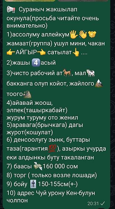 Айгыр 5 жаш Бою 160 см Баасы 300000 сом Байтик айылында Чуй