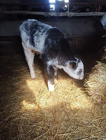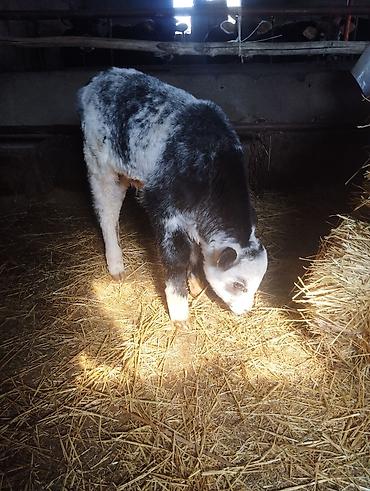 Бык-подросток черной масти, с биркой в ухе. Содержится в стойле, на грубом и сочном корме. Плотный костяк, развитая мускулатура, прямой постав ног. Подходит для откорма на мясо или для разведения. ...