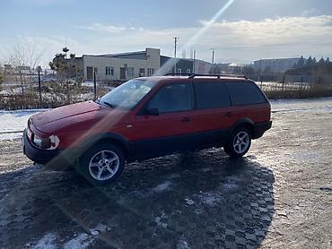 Volkswagen Passat Variant (универсал), красный цвет кузова с черным пластиковым обвесом. Эмблемы и шильдик Passat на пятой двери. Кузов типа универсал с рейлингами на крыше. Тонированные боковые и задние стекла. Литые диски (5‑спиц), низкопрофильные шины. Фары прямоугольные, задние фонари секционные. Бампера и молдинги темные, есть расширители арок. Задний дворник, спойлер кромки крыши, прицепное устройство (фаркоп). Пятитürный салон с большим багажником и высокой погрузочной кромкой. Передний привод (по компоновке), выхлоп с насадкой. Номерной знак формата KG (Кыргызстан). Отличный семейный универсал с вместительным багажным отделением, практичным салоном и надежной механикой, удобен для города и поездок за город.
