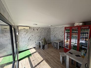 - Зал для гостей: несколько столиков с табуретами, кондиционер, панорамные окна.