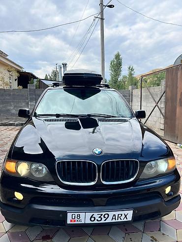 BMW X5 (E53), черный цвет кузова. Полноразмерный кроссовер с фирменной решеткой BMW и легкосплавными дисками. Установлены рейлинги и багажный бокс на крышу для дополнительного объема перевозки.