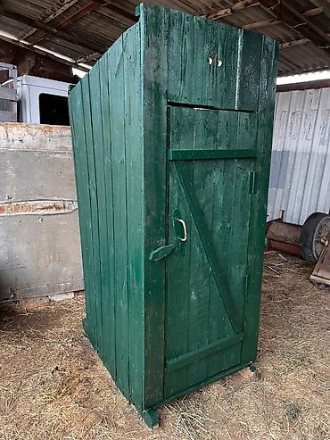 Деревянный дачный туалет (кабинка) - Материал: строганая доска, каркас из бруса. Снаружи окрашен в тёмно‑зелёный цвет атмосферостойкой краской. - Конструкция: цельная переносная будка на опорных «...