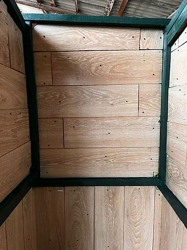 Кладовка или туалет. - Каркас: профильная металлическая труба. - Обшивка: поликарбонат коричневого цвета; внутри часть стен закрыта листами OSB. - Дверь распашная, с обеих сторон. - Пол: кафель. -...