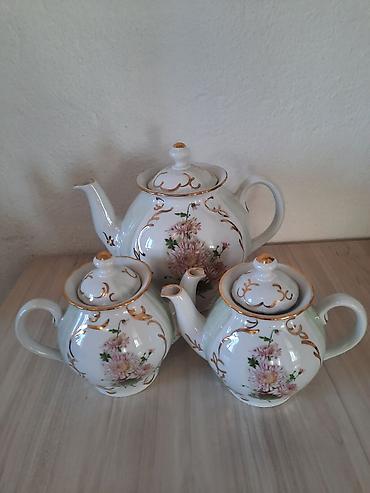 Фарфоровый чайный набор из 3 чайников с крышками.