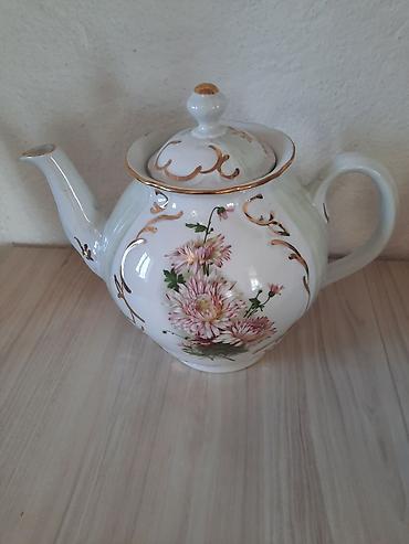 - Декор: розово‑кремовые хризантемы и витые золотистые узоры; золотистая окантовка по краям крышек, носикам и ручкам.