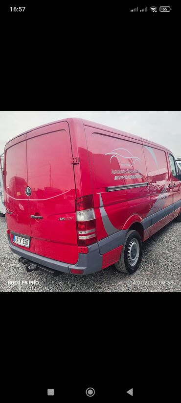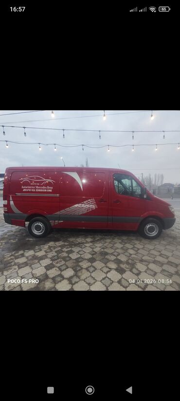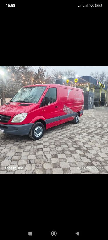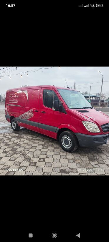 Mercedes-Benz Sprinter (редкая длина L1H2, короткая база, высокий кузов). Яркий красный фургон без остекления грузового отсека.