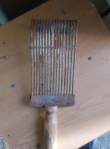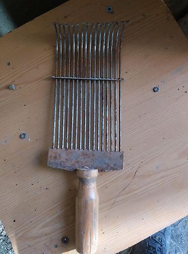 - Конструкция: плотный ряд из металлических зубьев (около 20), загнутых полукругом сверху для удобного протягивания пучка волокон; фиксирующая поперечная планка; деревянная рукоять для надёжного хвата.