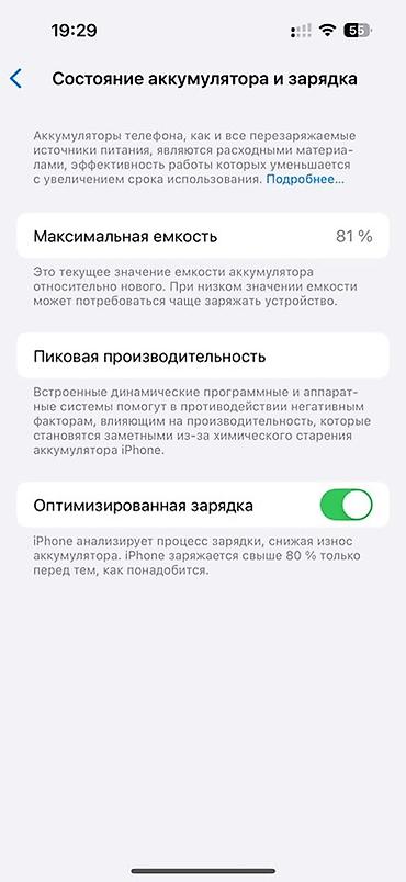 - На скриншоте: максимальная емкость аккумулятора 81%, включена «Оптимизированная зарядка»