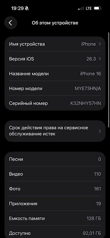 - Модель: iPhone 16 (номер модели MYE73HN/A)