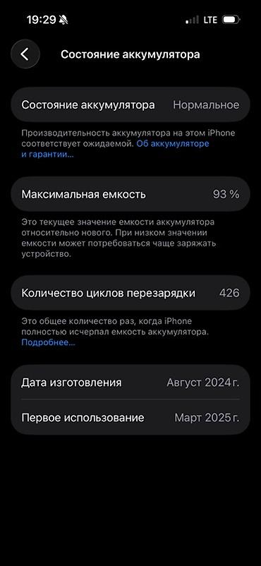 - Аккумулятор: состояние «Нормальное», максимальная емкость 93%, 426 циклов перезарядки
