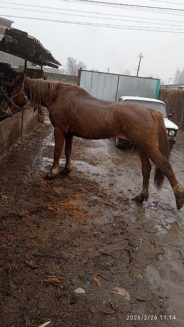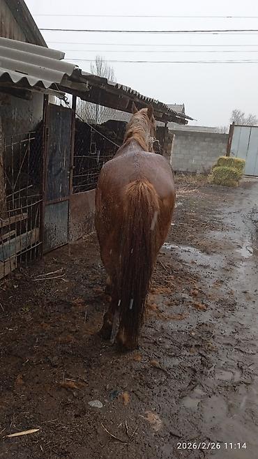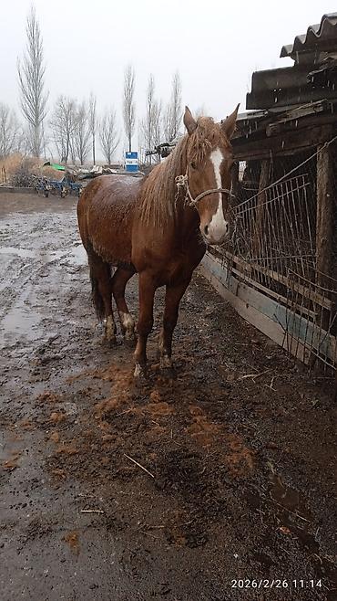 Лошадь рыжей масти с белой проточиной на морде и светлыми отметинами на ногах. Крупная, мускулистая, с длинной густой гривой и хвостом. Корпус широкий, глубокая грудь, крепкие ноги с хорошими копытами. На фото стоит в недоуздке, спокойно реагирует на человека и окружающую обстановку. Подходит для хозяйственных работ, упряжи и верховой езды. Удобный рост — легко оседлать и запрячь; шаг уверенный, движения ровные. Неагрессивный характер, контактная, ориентирована на работу и общение. Отлично адаптируется к уличному содержанию, не прихотлива в кормлении (сено/овёс). Возможна работа как одиночкой, так и в паре. Дата съёмки на фото: 2026/02/26.