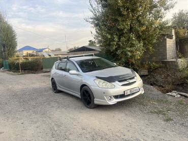 Toyota Caldina, универсал, правый руль. Серебристый цвет кузова, аэродинамический обвес, дефлектор капота с надписью Caldina. Черные легкосплавные диски, низкопрофильные шины. Противотуманные фары, ксенон/линзованная оптика. Рейлинги на крыше с установленным багажным/поперечинами.