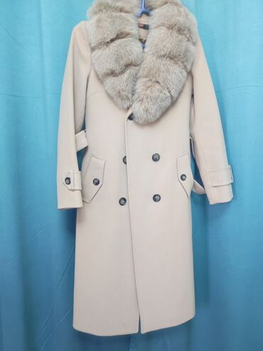 - Модель: двубортное пальто с крупным съемным меховым воротником-шалью (натуральный мех на воротнике по каталонке бренда).