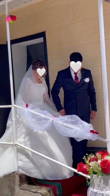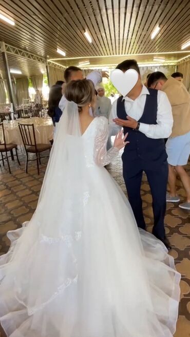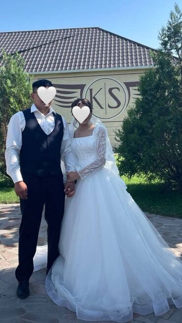 Элегантное женское свадебное платье белого цвета с длинными рукавами и пышной юбкой. Платье украшено изящной вышивкой на лифе и рукавах. Рукава выполнены из полупрозрачной ткани, дополненной кружевными аппликациями. Длинный подол придает наряду торжественный вид, идеальный для свадебной церемонии. В комплекте с платьем идет фата средней длины, гармонично дополняющая образ.