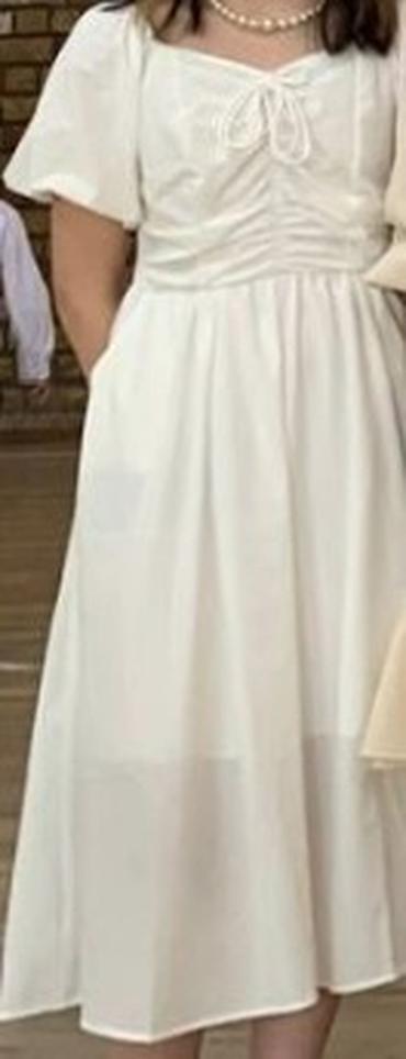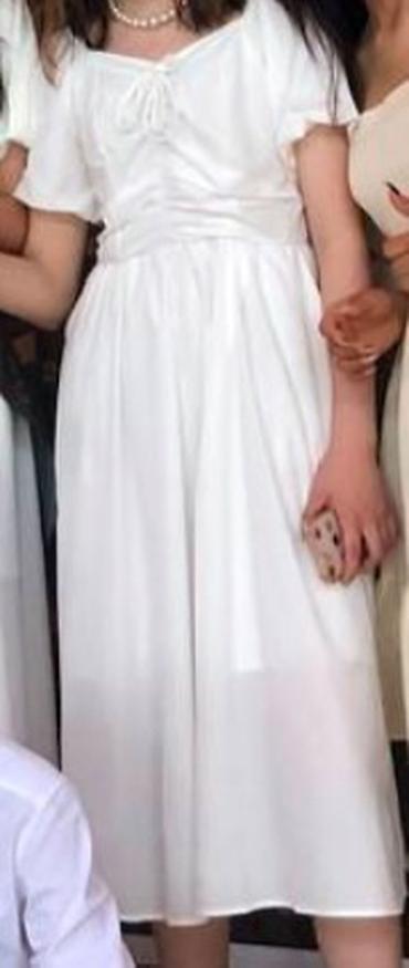 Белое женское платье миди в романтическом стиле.