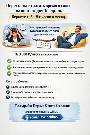 Перестаньте тратить время и силы на контент для Telegram. Верните себе 8+ часов в месяц.