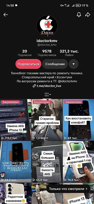 Примеры работ и процесс ремонта публикуются в техноблоге мастера: idoctorkmv (@idoctor_kmv). Есть закрепленные видео: замена АКБ на iPhone, восстановление олеофоба, инструкции по наклейке стекла, случаи «тяжелых» ремонтов.