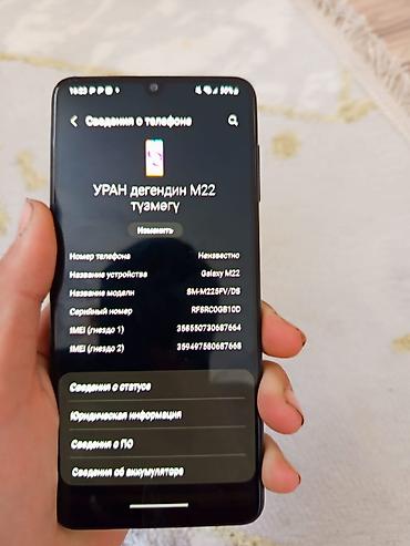 - Модельный номер и сведения о устройстве показаны на экране: Galaxy M22, SM‑M225FV/DS.