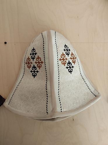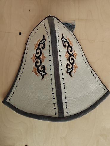 Традиционная кыргызская шапка калпак. - Материал: плотный войлок (светлый), хорошо держит форму. - Цвет и отделка: белый калпак с контрастной черной окантовкой и декоративной вышивкой по бокам. ...