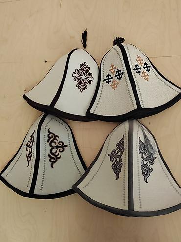 Калпаки из войлока с вышивкой - Традиционные киргизские головные уборы (калпак) из плотного белого войлока. - Геометрический крой из четырёх клиньев, контрастная окантовка и декоративная машинная ...