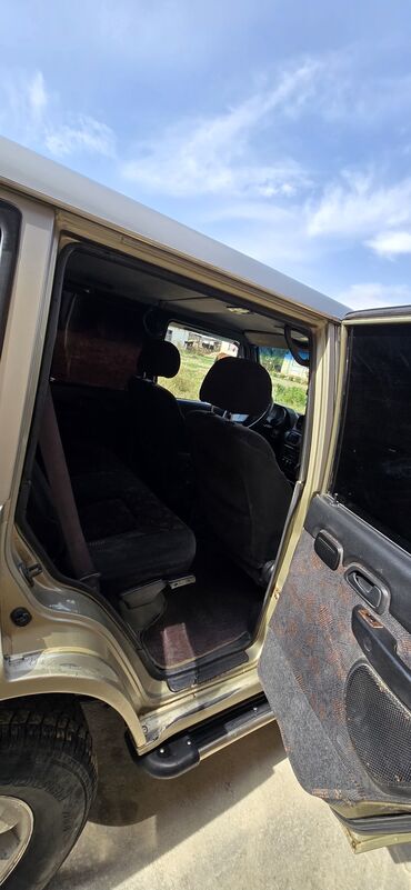 Внедорожник 5-дверный с высокой посадкой и широкими подножками. Салон тканевый, темный, второй ряд – полноценный трехместный диван с подголовниками и ремнями безопасности. Передняя панель с классическими круглыми дефлекторами, ручным управлением климатом и аудиосистемой. На дверях – тканевые вставки, карманы и электрические стеклоподъемники. Пол застелен ковриками, есть ручки-«палки» для удобной посадки. Снаружи установлены силовые боковые пороги, шины вседорожные с выраженным протектором, высокая клиренсная арка. Отлично подходит для поездок по грунтовкам и семейных выездов: просторный задний ряд, удобный доступ через широкие двери, хорошая обзорность.