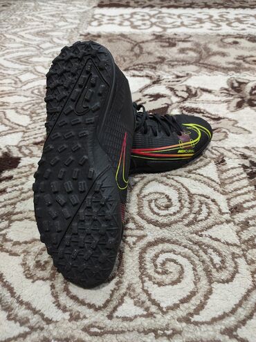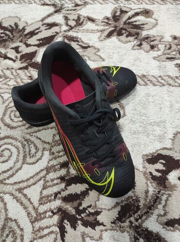Футбольные бутсы бирюзового цвета с белыми элементами. Обувь оснащена шипами для оптимального сцепления с поверхностью, что делает ее подходящей для использования на футбольных полях и искусственны...
