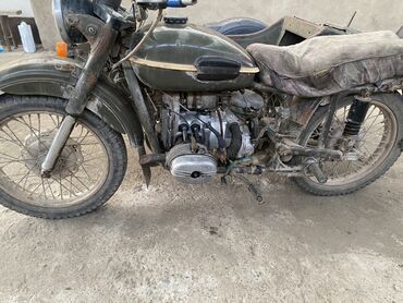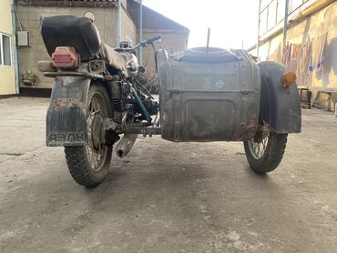 Мотоцикл, окрашенный в темно-зеленый или оливковый цвет, с коляской. Он оснащен круглыми фарами и широкими крыльями, что придает ему классический вид. Металлические спицы на колесах указывают на прочность конструкции. Сиденье, покрытое чехлом, и изношенный вид в целом свидетельствуют о долгом использовании. Коляска добавляет функциональности, позволяя перевозить пассажира или груз. Этот мотоцикл подходит для любителей винтажной техники или для использования на бездорожье.
