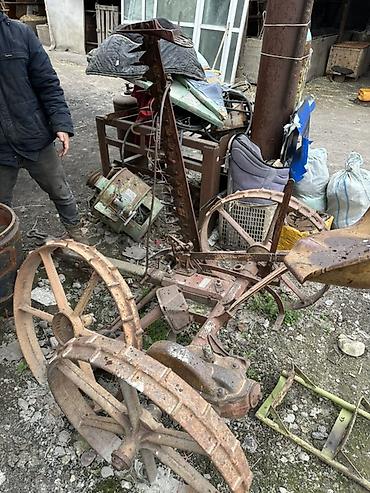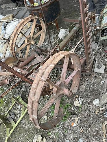 - Механическая косилка с сиденьем оператора и двумя металлическими колесами повышенной проходимости.