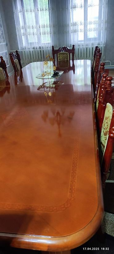 Большой обеденный гарнитур: раскладной стол + 12 стульев.Состояние отличное.Район Арча бешик Шералиева+Эртайлак. - Материал: массив/шпон дерева с глянцевым лаком. - Форма столешницы: прямоугольна...