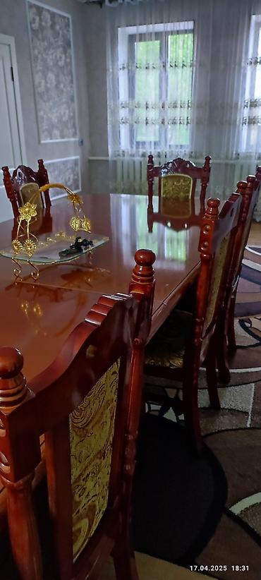 Продам комплект -стол и 8 стульев, карагач, б/у в идеальном состоянии, размер стола ширина 110см, длина 180см и 220см в развёрнутом состоянии, цена 49000сомов