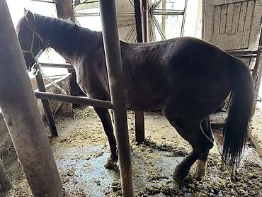 Лошадь темно-рыжей масти с густой черной гривой и хвостом. Крепкий корпус, широкая грудь и развитая задняя часть, толстые конечности с плотными копытами. Высокая шея, спокойная голова, уши стоячие. На фото — в станке/стойле, закреплена веревочным недоуздком. Подойдет для хозяйственных работ, упряжи и верховой езды после соответствующей подготовки. Масть ровная, без выраженных белых отметин, на задних ногах видны светлые «чулки». Статная, выносливая, с хорошим костяком.