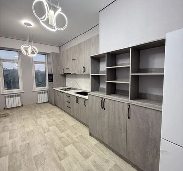 - Кухня: линейный гарнитур во всю стену с множеством систем хранения, встроенная варочная поверхность, духовой шкаф, выдержанный стиль фасадов, светодиодные дизайнерские светильники, два больших окна, батареи под каждым окном. Отдельная столовая зона у окна с обеденным столом и стульями.
