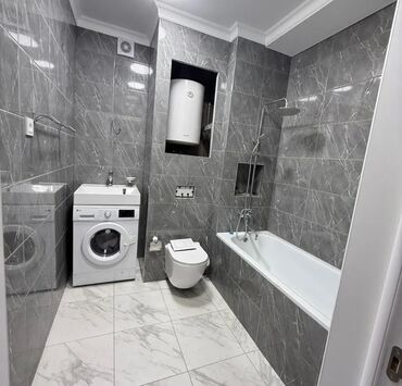- Санузел: облицовка керамогранитом, ванна с душевой стойкой «тропический дождь», подвесной унитаз с инсталляцией, ниша-полка, стиральная машина, электрический водонагреватель, вытяжной вентилятор.