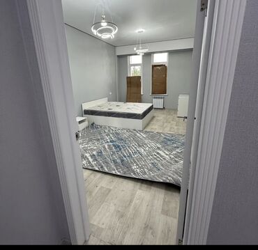 - Спальня: двуспальная кровать с матрасом, прикроватная тумба, комод; высокие потолки и современные потолочные светильники.