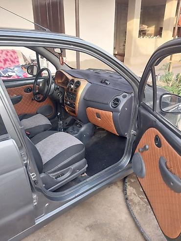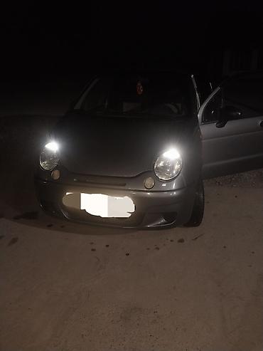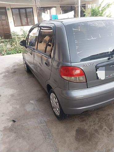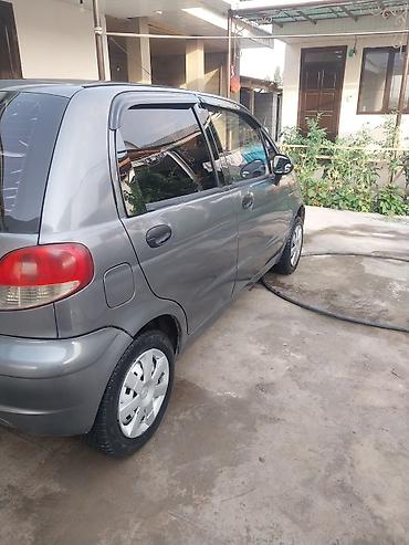 Серый хэтчбек Daewoo Matiz, компактный городской автомобиль. Оснащен круглыми фарами, вертикальными задними фонарями и задним стеклоочистителем. Имеет четырехдверный кузов и легкосплавные диски. Подходит для комфортного передвижения по городу и парковки в ограниченном пространстве.
