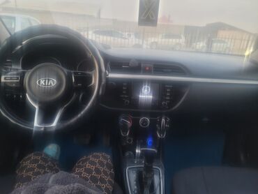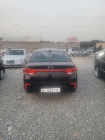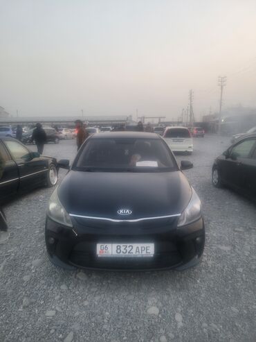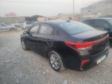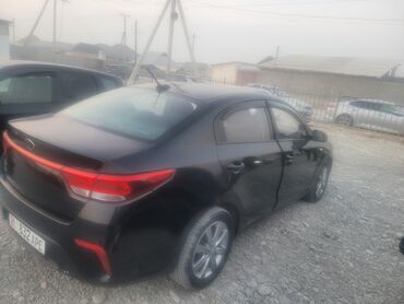 Kia Rio седан, черный цвет кузова. Автоматическая коробка передач (селектор с режимами P-R-N-D). Интерьер с мультимедийной системой: экран, радио, медиа, кнопки меню/настройки/клавиши предустановок, USB/AUX. Рулевое колесо с мультифункциональными кнопками (управление аудио и круиз-контролем). Кондиционер и отопитель с ручным управлением, рециркуляция, обогрев заднего стекла. Электростеклоподъемники, центральный замок. Передние и задние подстаканники, розетка 12V/прикуриватель, разъемы для зарядки. Тканевый салон, регулируемые передние сиденья. Легкосплавные диски. Светотехника: галогенные фары, большие задние фонари с соединительной световой линией. Кузов — 4 двери, просторный багажник. Номерной знак KG.