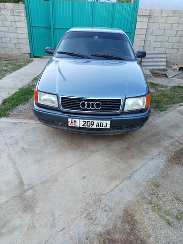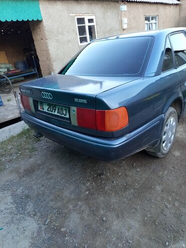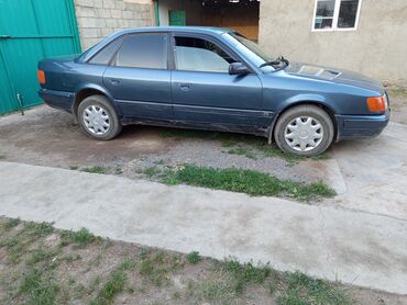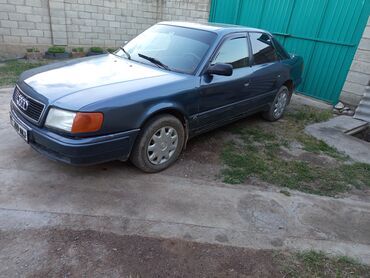 Audi 100 C4 седан, темно-синий, правый руль отсутствует (классическая европейская компоновка). Кузов 4-дверный, заводские колпаки Audi на стальных дисках. Задние стекла тонированы. Передняя оптика с прямоугольными фарами, оригинальная решетка с эмблемой.