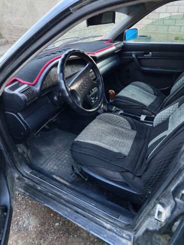 Салон: черная передняя панель, тканевая обивка сидений с накидками, чехол на руле с логотипом Audi, приборная панель аналоговая. На торпедо установлен защитный коврик. Ручка КП — деревянная накладка, центральный подлокотник/тоннель с нишами. Пол — резиновые коврики. Электростеклоподъемники передние, центральный замок (кнопка на двери водителя), наружные зеркала с ручной регулировкой. Пепельница/прикуриватель, штатные дефлекторы обдува, регулировка подсветки приборов.