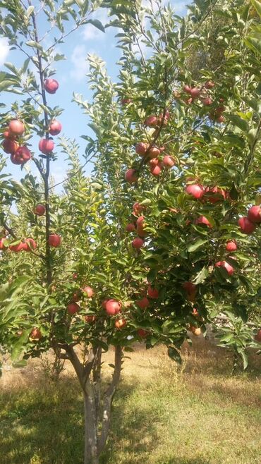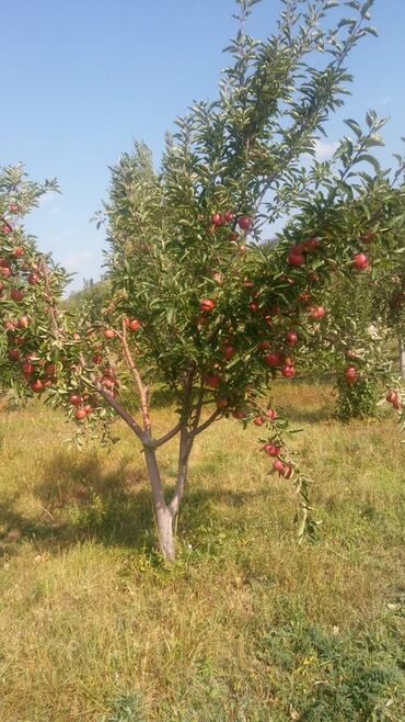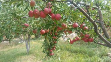 - Плодовый сад с ухоженными рядами яблонь (видны деревья с урожаем красных яблок), зелёные газоны между рядами.