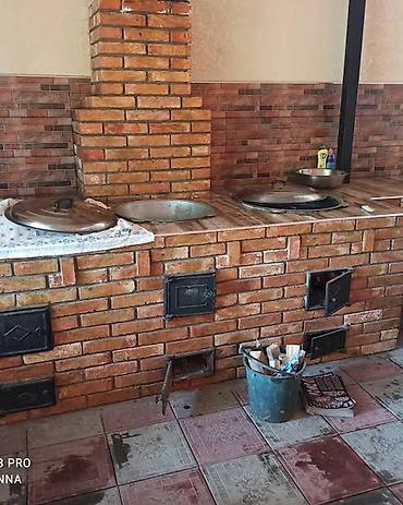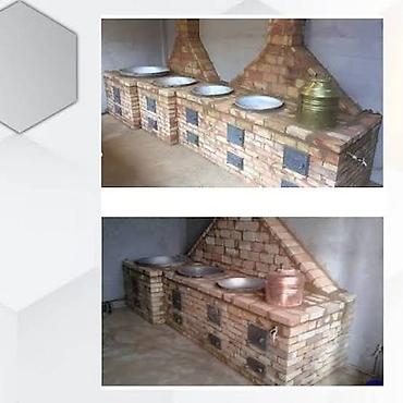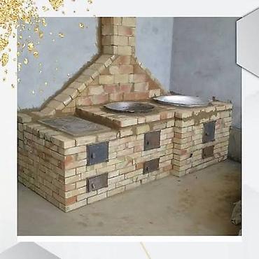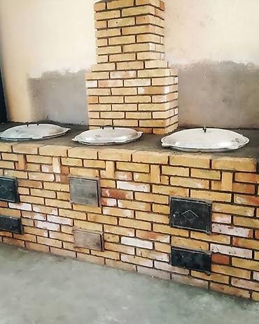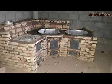 - Стационарная печь из полнотелого кирпича с дымоходом, рассчитана на несколько рабочих постов (2–4 очага).