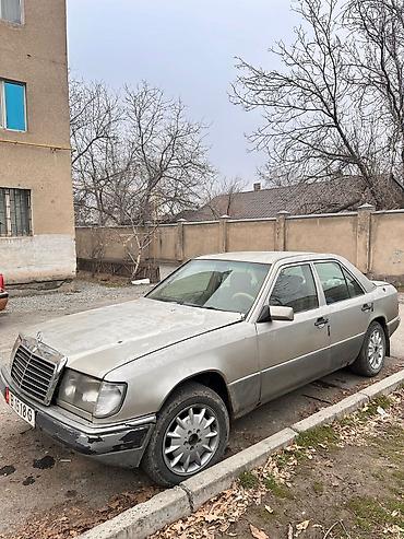 Mercedes-Benz E-Класс W124, седан, правый/левый руль не указан. Классический кузов с характерной прямоугольной оптикой и фирменной решеткой радиатора. Цвет — серебристо-серый (металлик). Колесные диски — оригинальные литые Mercedes 15". Молдинги по периметру, хромированная окантовка решетки и эмблема на капоте.