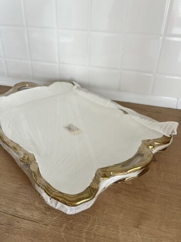 Металлические сервировочные подносы с декоративной гравировкой и золотистыми элементами. - Материал: нержавеющая сталь с зеркальной полировкой. - Декор: центральный орнамент в овальной рамке, раст...