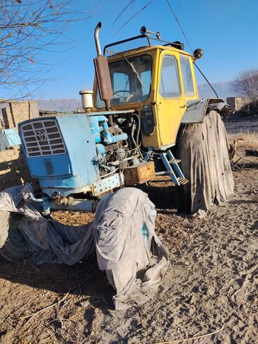 - Колесный трактор ЮМЗ‑6 (кабина желтая, капот синий), дизельный двигатель, вертикальный выхлоп, механическая трансмиссия.