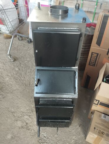 Металлическая печь-камера (котёл/буржуйка) для твердого топлива. Характеристики: - Корпус из толстой стали, прямоугольная форма. - Три отдельные дверцы на фронтальной панели: верхняя (топочная), с...