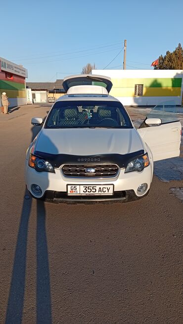 Subaru Outback универсал (правый руль). Полный привод Symmetrical AWD, клиренс повышенный. Белый цвет кузова, черный дефлектор капота с надписью Outback. Литые диски бронзового цвета, всесезонные шины. Противотуманные фары, ксенон/линзы в головной оптике, рейлинги на крыше. Панорамная пятая дверь, удобная погрузка багажника. Салон темный, на сиденьях установлены чехлы-алмазная стежка; передний ряд с подлокотниками. Мультируль, центральный дисплей/магнитола, климатическая система, электропакет, подушки безопасности. Номерные знаки KG 355 ACY. Практичный семейный универсал с проходимостью кроссовера и фирменной устойчивостью Subaru на любых дорогах.
