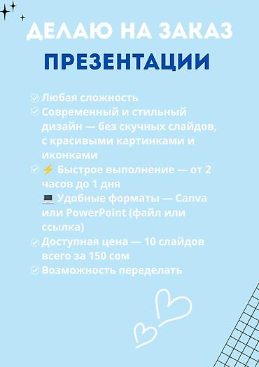 - Создание презентаций «под ключ»: учебные, деловые, отчётные, информационные.