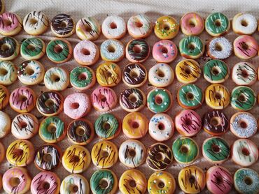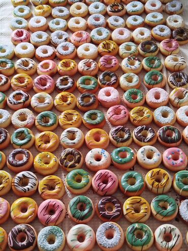 - Подача: яркая палитра цветов (розовый, зелёный, белый, жёлтый, коричневый), пончики гармонично сочетаются в наборах для детских и семейных мероприятий, офисных кофе-брейков.