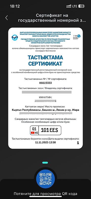 Особенный государственный регистрационный номер КР: 01KG011QSH Цена 300$ каждая Сразу переоформила на ваше имя - Формат: 01 KG 011 QSH (регион 01, флаг КР, серия QSH) - Тип: номерной знак с особен...
