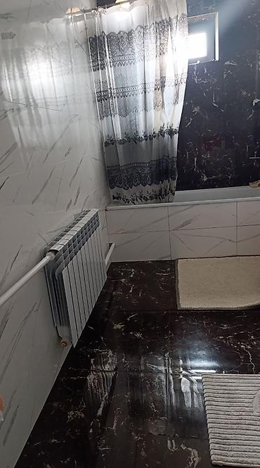 - Санузел с ванной: стены и экран ванны облицованы крупноформатной плиткой «под мрамор», контрастный темный пол, компактное окно для естественного света, радиатор отопления, защитный поручень, текстильные шторы и коврики.