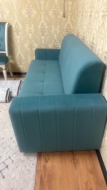 - Диван прямой, обивка бархатистая/велюровая бирюзовая, широкие подлокотники, вертикальная прострочка на спинке и сиденье, компактная глубина — удобен для кухни или гостиной.